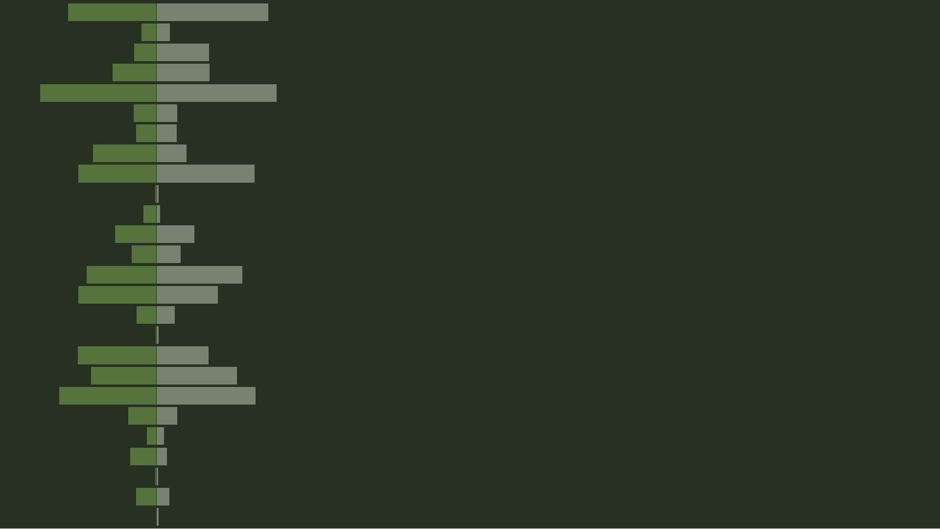 dev.off()The previous section picks the color scheme for the graphics. The colors come from the Calathea theme found here. The color scheme sets a dark green for the background with two lighter greens for the bars.