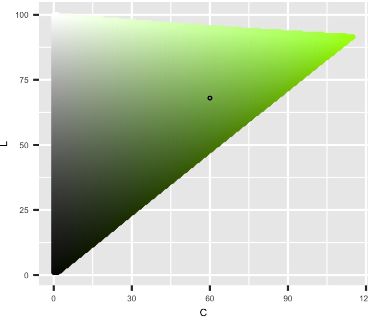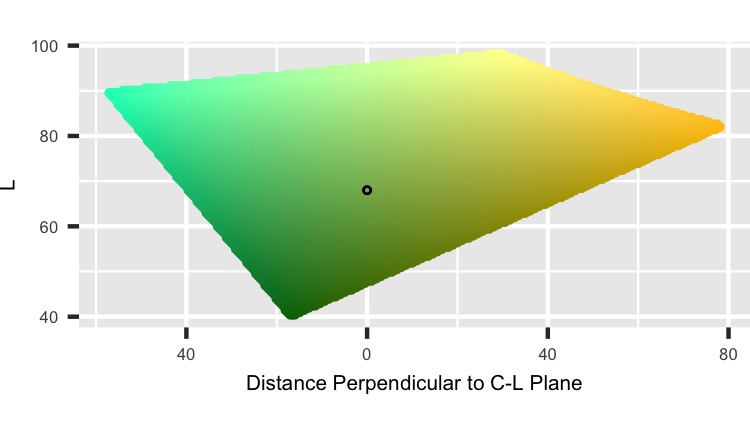 Now we can look at cutting horizontally through the HCL color space where L = 68. (L_point = 68)