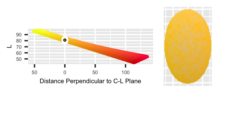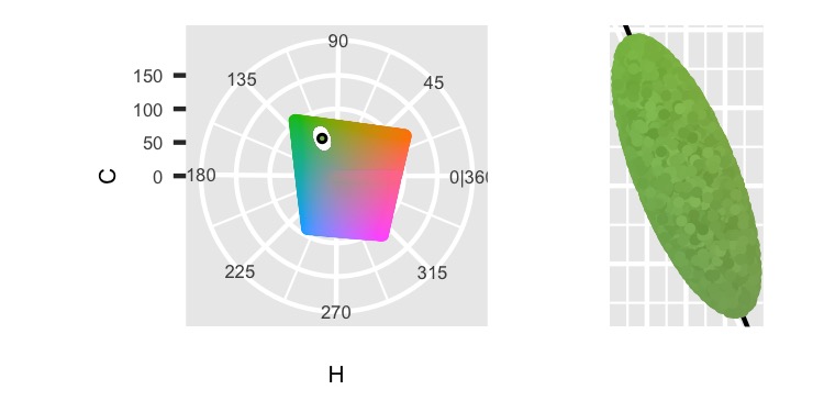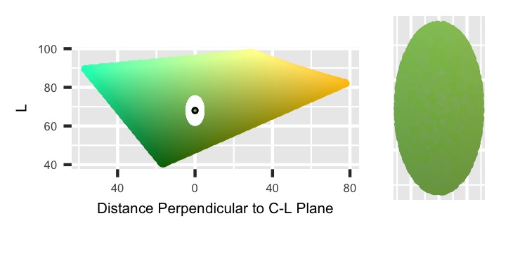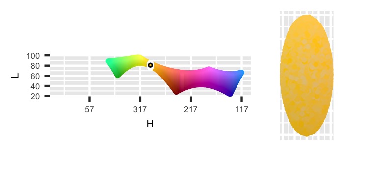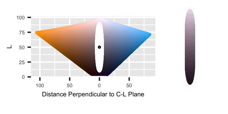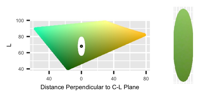 Finally, the HCL color space is oddly shaped, so it’s possible to sample points distributed unevenly along either side of the H_point value. That could shift the overall average Hue. To prevent that, I’m adding a catch that if the point couldn’t exist on the other side of the Hue values, then discard it. That’ll make the final regions trimmed out of the ellipse to be symmetric across H_point.