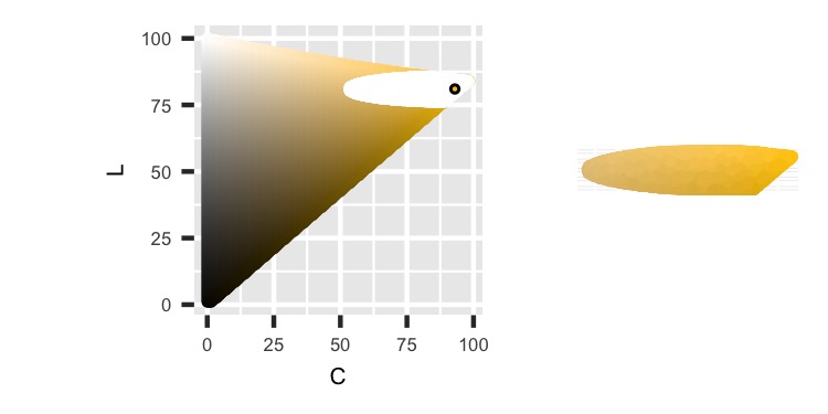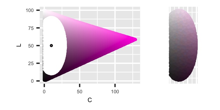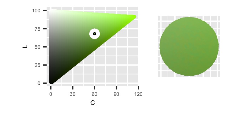 We can see the different colors as Hue moves around a circle and their increased intensity as Chroma moves out to the edges. The shape is not circular because the HCL color space isn’t.