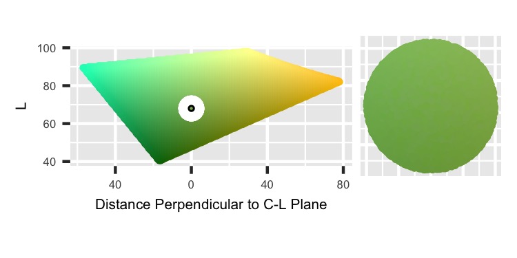 There is one more graph to see. We looked at cutting the HCL color space along the Hue, Chroma, and Luminance values, but the Chroma image was a flattened curve. So instead, we can cut a plane at the Chroma value but tangent to the circle a constant Chroma value creates. The following image sets up the explanation, and then we’ll see the actual plane.